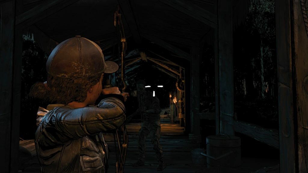 Gameplay has also been changed up in some minor ways. Most notably, the addition of controller vibration in tense situations. If this has happened the whole time, then let me know but personally, I’ve never experienced vibrations like this and it truly made me jump. Opening a door, creeping past guards; any kind of edge-of-your-seat moment, the controller shakes in your hands, adding another layer of nervousness to the goings-on. Speaking of creeping around, there were more open exploration sections in this episode than any Walking Dead episode before it. I was so free, it felt like Guardians of the Galaxy again. Especially in the Delta base, Clementine climbs ladders, encounters compound bow shootouts, and even swims. This combination of quick time events and free-roaming made it feel even closer to a third-person action adventure game than the interactive movie it’s so often perceived as. Couple this with the returning walker combat sequences, and there’s no excuse why there can’t be a really good third-person Walking Dead game in the future. Unfortunately, in Broken Toys, the combat levels are still very unsure of themselves. Their biggest downfall is that they seem to be much more open than they actually are, and invisible barriers make it difficult to plan attacks in a timely fashion. I did enjoy the new look of the walkers in this episode, though, and the ability to stun or kill (thanks to returning character, James), makes for differing fighting styles among players. I just wish Skybound could work on making walker fights less annoying.