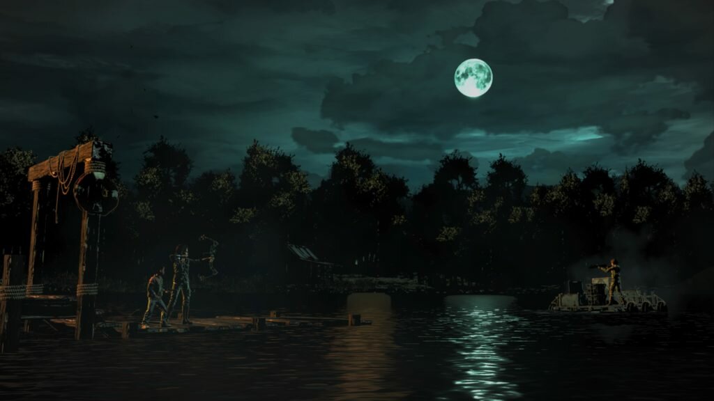 Take Us Back quite literally starts with a bang, and the boat escape consists of some of the most action-driven and quick-time pressure I’ve ever seen Telltale/Skybound do. Precariously teetering on the edge of an exploding ship as it sinks into the river, Clementine is tasked with jumping from platform to platform – not to mention the existing raiders still putting up a fight – with walkers roaming freely below her all the while.